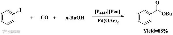 接着,作者进一步研究了碳负离子液体与CO的吸收作用机理,通过量化理论计算、红外光谱和核磁共振碳谱等结果,证明碳负离子亲核进攻CO后形成了含醛基的三羰基化合物中间体。与此同时,碳负离子液体捕获的CO可在室温常压下发生羰基酯化反应,进一步转化为具有高附加值的苯甲酸酯等精细化学品(图3)。该项工作提出的碳负位点捕集CO与催化转化耦合的新策略,对研究开发高效的CO捕集材料以及温和条件下的羰基化反应有极大的促进作用。
