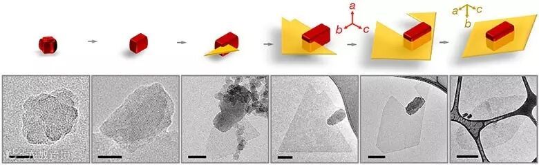 整个纳米片的生长过程可以描述为:由晶种外延缓慢的外延附生生长转变为快速的纳米片生长。如何解释这样的生长过程呢?通过实验研究者发现,晶种与纳米片拥有共同的c轴,但是他们的ab轴旋转了90度。纳米片的生长需要在晶种达到一定形状和尺寸的时候才会发生。当纳米片生长开始的时候,其暴露出的高指数晶面活性较高且倾向于面内的快速生长,直到完整的晶面生长完成。