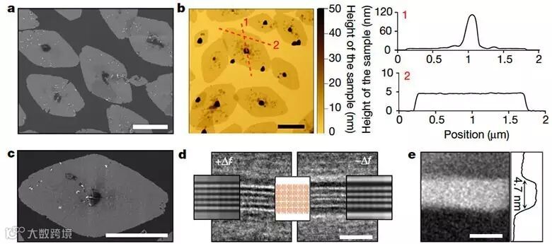 通过高分辨率的电子显微镜可以发现,生长的外延部分厚度要比晶种附近薄一些,但是随着生长的进行,纳米片整体厚度变得均匀。纳米片的最终厚度约为5纳米,差不多是2.5个b轴晶胞的尺寸。