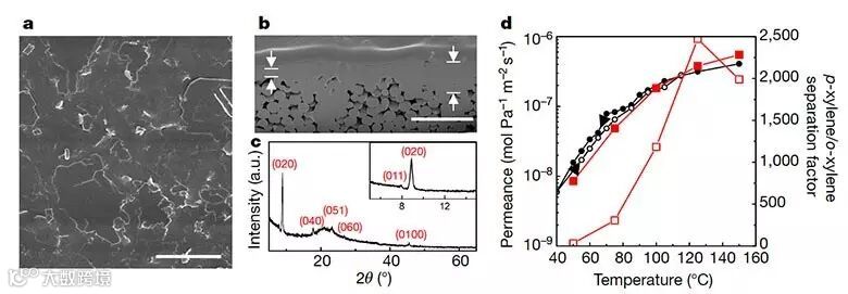 紧接着,研究者在沉积了上述纳米片的支撑面上进一步生长,使晶体形成连续的薄膜,厚度在250纳米至1微米。随后研究者将该薄膜用于邻二甲苯中对二甲苯的分离。薄膜的对二甲苯渗透性较高,在125摄氏度下分离比可达2500(最高可接近8000),而文献中目前报道的最高分离比在1000左右。另外,该膜的稳定性也十分优异。