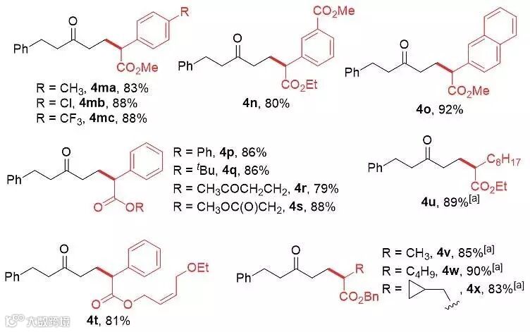 随后,作者还对重氮化合物进行了底物拓展。不管是富电子还是缺电子的芳基重氮乙酸酯化合物都能以不错的收率得到相应的产物(4m-n),而萘取代的重氮化合物的反应收率则可以达到92%(4o)。值得注意的是,更换酯基取代基后,该反应的效率也没有受到影响,都能以良好的收率得到相应的开环产物(4p-t)。随后作者也考察了烷基重氮乙酸酯化合物,这些重氮化合物由于本身在金属催化剂条件下的稳定性相对较低,所以需在反应中加入两当量,此时的收率也较为理想(4u-x)。