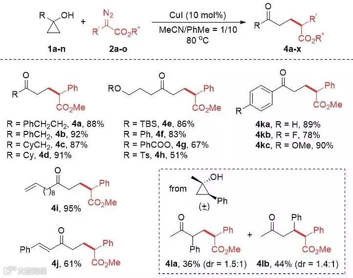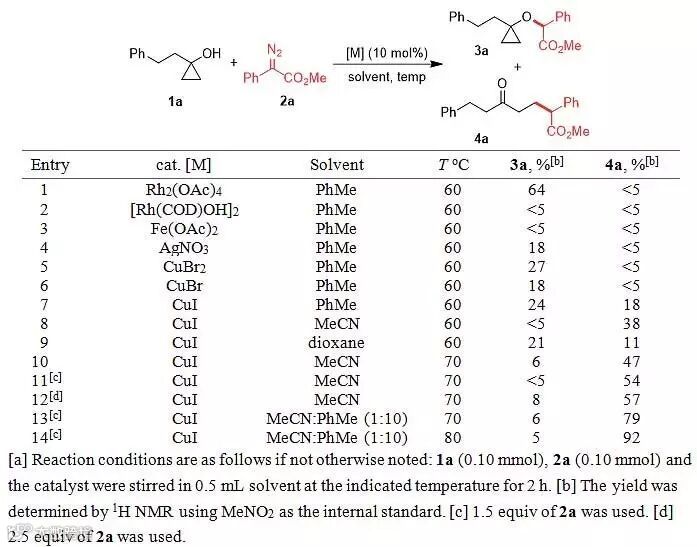 传统的反应过程中环丙醇作为一种醇类化合物,能够很好地与重氮化合物实现O-H键的插入过程。作者使用苯乙基环丙醇和苯基重氮乙酸酯作为反应底物,当使用醋酸铑作为催化剂,甲苯为溶剂时,能够以64%的收率得到相应O-H键插入的产物,这也是该类反应中最为常见也很难避免的副反应。作者随后进行了大量的尝试来试图改变反应的选择性,最后发现,当使用CuI时,反应中除了24%的O-H键插入产物以外,还有18%的开环偶联产物。随后作者进一步优化得到最优的条件。值得注意的是,这里使用了乙腈和甲苯作为混合溶剂,很好地兼顾了转化率和选择性。