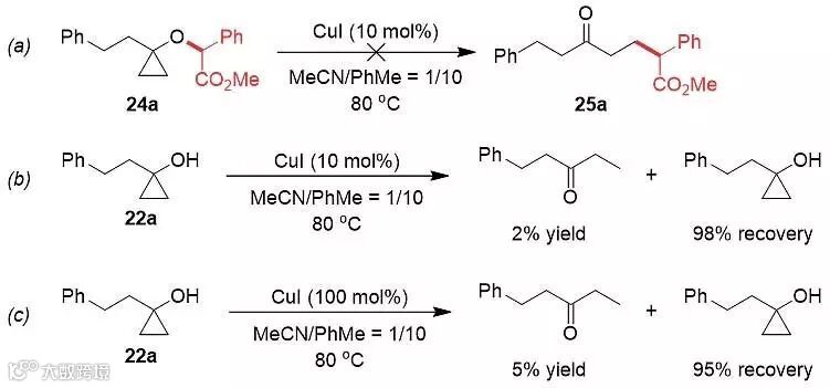 完成底物拓展后,作者还进行了相关机理的探究。首先,他们将条件筛选过程中发现的O-H键插入的产物在标准条件下参与反应,可以发现该化合物不能转化为目标产物,这就说明反应中两者经过不同的反应路径。另一方面,他们还尝试了环丙醇底物本身在10%化学计量条件下的与CuI混合的反应,只观察到2%的开环产物生成,主要回收得到98%的原料。即使将CuI的用量提高到100%,环丙醇的开环效率也并不理想,只有5%的酮生成,仍有95%的原料回收,这也说明环丙醇在该反应体系中并没有得到相应的烷基铜物种,排除了环丙醇先开环再分解重氮化合物的反应机理。