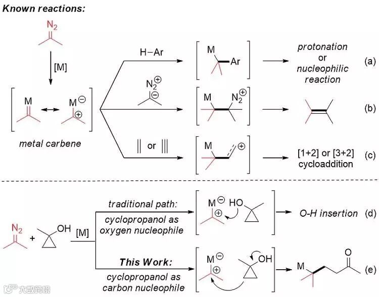 近年来,过渡金属催化的重氮化合物转化为相应的卡宾物种已经成为有机合成中一类重要的反应。其中,重氮化合物与后过渡金属形成的亲电金属卡宾物种能够与不同类型的亲核试剂反应,特别是杂原子亲核试剂与之作用能够提供一种合成碳-杂原子键的方法。但是,碳亲核试剂与金属卡宾的反应则相对较少,已知的过程主要分为三类:a)富电子的芳香烃或者芳香杂环作为亲核试剂,随即形成苄基金属物种参与后续的转化,进而构造C(sp2)-C(sp3)键;b)重氮化合物作为亲核试剂,实现形式上的二聚过程,提供了一种新型的构建C=C双键的方法;c)烯烃或者炔烃作为亲核试剂,得到的中间体能够发生进一步转化实现[1+2]或者[3+2]的过程。可以看出,碳亲核试剂相关的反应仍需要进一步拓展。基于此,来自北京大学的王剑波课题组首次使用环丙醇作为亲核试剂,实现了与重氮化合物的开环偶联反应。
