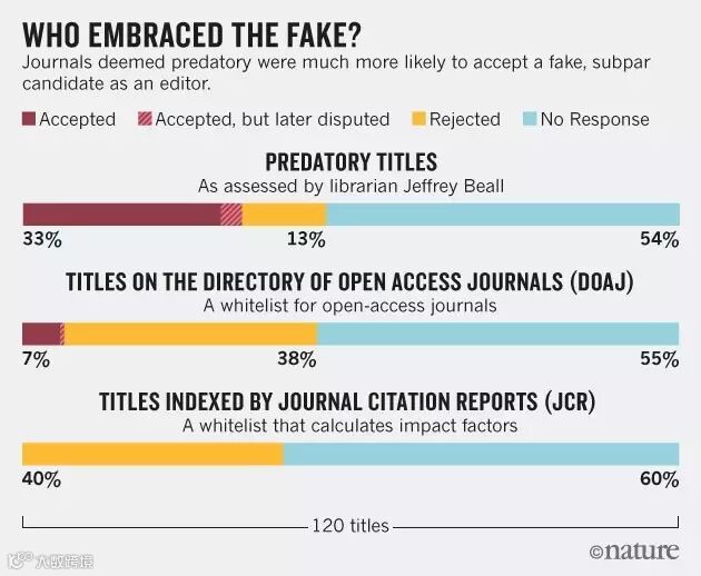 嗯,就算再假,好歹也有了个身份不是,接下来,该给期刊们发申请信了。该选择什么样的期刊呢?考虑到代表性,Pisanski等人选择了三大类期刊,分别是:JCR期刊、开放获取名录(DOAJ)期刊、“Beall黑名单”期刊(这份黑名单是美国科罗拉多大学图书管理员Jeffrey Beall制定的,列出的出版商或期刊均有掠夺性嫌疑,诡异的是,后来这份黑名单消失了,原因不明)。接下来,Pisanski等人请两名不知情的研究生在这三大类期刊中均随机选取120种作为样本,这样一共是360种。好了,一切就绪,下面就可以发电子邮件申请了!