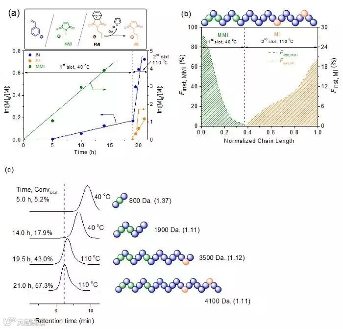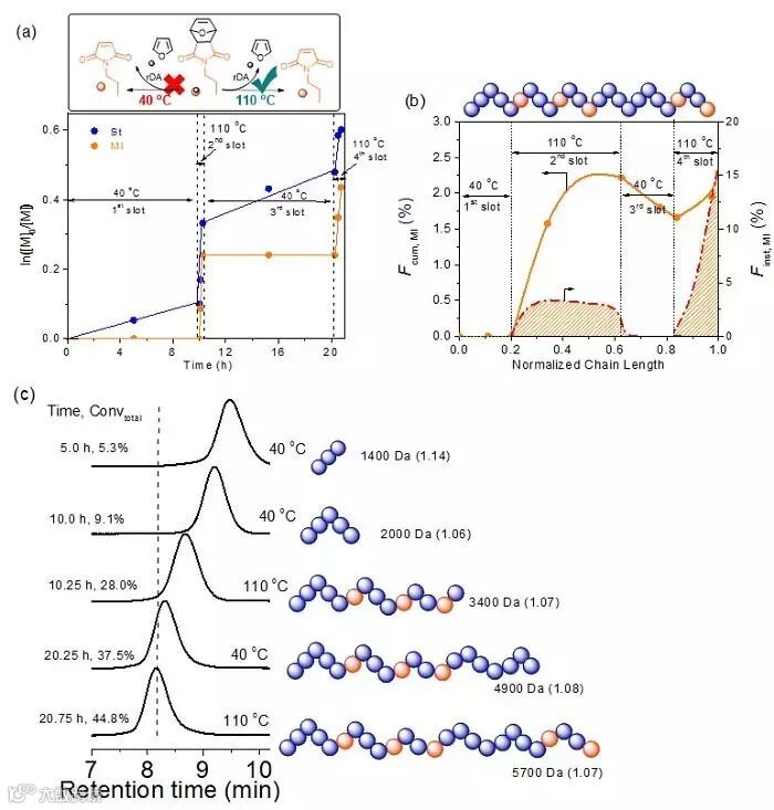 苏州大学研究团队发展的基于潜在单体的序列调控策略操作简便且单元序列明晰。他们将呋喃保护的马来酰亚胺作为潜在单体,苯乙烯作为共聚单体,利用可控自由基聚合方法进行序列调控。该呋喃保护的马来酰亚胺潜在单体在自由基聚合条件下,既不能均聚,也无法与苯乙烯发生共聚。将潜在单体与苯乙烯按照一定配比投料,在相对较低的温度下(40 ℃),苯乙烯单体开始进行均聚,生成“活性”的聚苯乙烯链段;反应一段时间以后,将聚合反应转移到高温(110 ℃)条件下,该潜在单体发生逆Diels-Alder反应而脱除呋喃保护基团,生成可发生聚合的马来酰亚胺单体,其立即与苯乙烯发生交叉共聚合,从而生成苯乙烯/马来酰亚胺杂化的聚合物链段。在可控自由基聚合过程中,通过程序地改变聚合温度(如40 ℃–110 ℃–40 ℃–110 ℃),可将马来酰亚胺单体嵌入聚合物链的指定位置,从而实现序列调控。