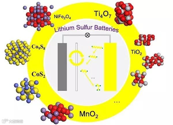 锂硫电池具有1675 mA·h·g-1的理论比容量(近五倍于石墨—钴酸锂电池的理论比容量)和2600 W h kg-1的能量密度,有望用于电动汽车供能系统,使其充一次电就可以跑400英里。但是目前锂硫电池的发展还存在一些技术瓶颈,比如放电产生的多硫化物在阴阳电极之间的穿梭效应,单质硫和放电产物硫化锂的低电导率,硫锂化/去锂化的体积膨胀问题还有负极金属锂的枝晶生长造成的安全问题等等。解决问题的方法之一就是在硫阴极引入高电导率的纳米金属氧化物或者硫化物,比如Ti4O7和CoS2,它们不仅提供电化学反应的基板,还可以有效吸附(相比石墨烯等碳材料)中间产物多硫化锂,甚至还可以当作催化剂促进多硫化锂与硫化锂的双向转化。总之,锂硫电池目前已经走在了正确的发展道路上,在其产业化之前,提高正极单质硫面负载率和解决锂金属阳极问题是必须解决的两个关键问题。