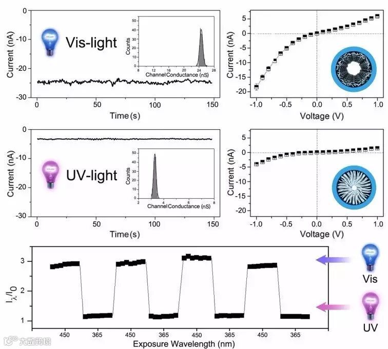 该团队利用含偶氮苯的DNA在PET模板上自组装形成了一个光响应纳米通道。其中,DNA具有很好的生物兼容性和可修饰性,而偶氮苯的引入更使其兼具光响应性。因此该团队所构筑的功能化的纳米通道能够通过紫外和可见光的辐照刺激来调控离子的跨膜传递特性。