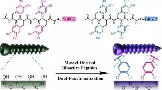 苏州大学团队所设计的仿生肽一端含有多重的DOPA氨基酸序列,另一端则为具有生物活性的多肽序列,如细胞贴附肽(RGD)和成骨活性肽(YGFGG)。在自然界中,DOPA氨基酸,即3,4-L-二羟基苯丙氨酸(3,4-dihydroxy-L-phenylalanine),广泛存在于贻贝类生物所分泌的粘附蛋白中。DOPA中的儿茶酚(邻苯二酚)可以和多种材料表面材料共价和非共价方式结合,是贻贝类生物附着于礁石、船只等表面的重要手段。研究证明,DOPA基团和二氧化钛表面在水中简单接触的情况下快速形成稳定的配位结合作用。与此匹配的是,钛合金材料表面都会被包覆一层致密、稳定的二氧化钛氧化层(2-20 nm)。鉴于此,上述设计的生物模拟活性肽则可以通过简单浸泡的方式“一步法”实现钛合金医用材料表面改性。