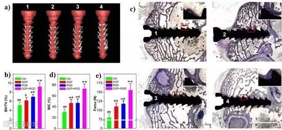 该仿生设计的生物活性多肽除了在体外能够有效地促进材料表面的细胞贴附和骨髓间充质干细胞成骨分化,动物体内也显示了良好的骨整合效果。该研究团队以医用钛钉和新西兰大白兔分别为钛基植入材料和动物模型,实验结果显示,通过仿生设计活性肽改性后的钛钉在植入新西兰大白兔股骨髁后,可以有效促进钛钉周围的骨生成。相比于没有改性的钛钉,联合使用RGD和YGFGG双功能多肽的钛钉在植入动物体内4周之后,骨体积的增量有效增加40%之多。力学拉伸结果同样表明,使用这一仿生活性改性后的钛钉在植入动物体内后的力学性可显著增加一倍之多,证实了体内的高效骨整合作用。