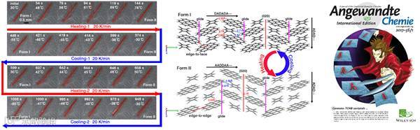 近日,新加坡南洋理工大学材料与工程学院的张其春副教授课题组与山东大学晶体材料研究所陶绪堂教授课题组合作,在有机共晶化合物——晕苯-1,2,4,5-四氰基苯(Coronene-TCNB cocrystal)的可逆相变过程中发现了显著的自修复行为。晕苯是一种具有很高对称性(D6h)的分子转子(rotator),已有相关工作研究过其在分子层面上的转动行为。该研究团队期望通过共晶的设计策略引入另外一种分子转子,将晕苯分子尺度上的转动放大到宏观尺度,进行制动。经过尝试,该团队发现当引入1,2,4,5-四氰基苯之后,所得的共晶材料具备了热诱导可逆相转变的特性,并具有肉眼可视的热制动行为。更为重要的是,晶体在相变过程中展示出非常明显的自修复性。比如,在升温过程中,在40摄氏度左右,晶体会发生很明显的大尺度开裂,随着温度继续升高,晶体开始发生显著的自我修复,到80摄氏度左右,本已破裂的晶体又重新变为一根单晶。通过单晶X射线衍射及衍射点质量分析,研究团队发现自修复后的材料其结晶性和单晶度也得到很好的恢复。此外,该自修复行为也可以在低温相转变区被发现,证明自修复行为是始终伴随着该材料相转变过程的。如前所述,由于所研究的是单晶材料,研究团队可以使用X射线衍射技术对这一现象进行了分子层面的研究和解释,结果显示相变前后晶体结构的整体相似性以及局部关键差异(堆积模式、转子取向和分子间作用力)是该单晶材料自修复行为的起源。