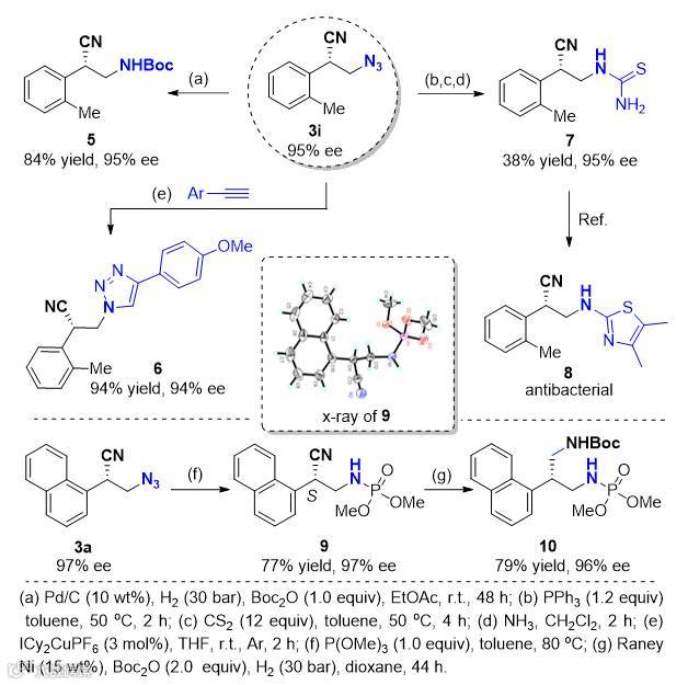 叠氮作为胺的前体,容易发生多种转化反应,该官能团可以在温和条件下还原得到手性的有机胺化合物5,可以发生click反应得到光学纯的三氮唑化合物6,或转化为手性硫脲化合物7,他们按文献方法可以进一步得到手性抗菌活性分子8的中间体。除此之外,手性的胺氰化产物3a还可以被转化为手性的1,3-二胺类化合物10。