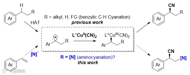 手性β-胺基腈为一类优势骨架,基于氰基的多重转化性,它可以转化为手性的1,3-二胺类化合物。这两类骨架存在于许多天然产物以及活性分子中。目前,此类化合物的合成都是通过复杂多步的方法,发展高对映选择性一步合成此类化合物的方法显得尤为重要。通过烯烃的不对称胺-氰化是合成手性β-胺基腈类化合物最高效的方法之一,然而至今该方面尚无报道。最近,中国科学院上海有机化学研究所的刘国生团队与香港科技大学的林振阳团队合作,通过胺(叠氮)自由基与烯烃加成,随后手性铜催化剂调控C-CN键形成时的手性控制,以高对映选择性得到β-胺基(叠氮)腈类产物。