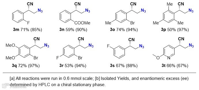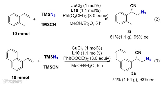 最后,克级规模的实验表明烯烃的叠氮-氰基化反应可以放大到10 mmol,反应依然能够以中等到良好的收率和优秀的对映选择性得到目标产物[3i(61%, 1.1 g), 95% ee; 3a(74%, 1.64 g), 93% ee]。