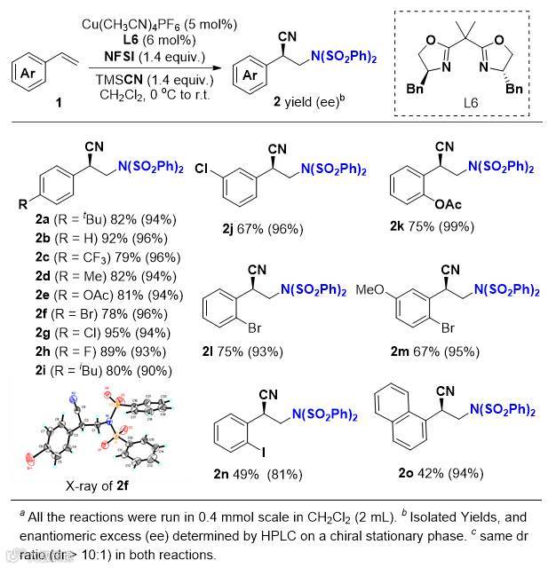 由于自由基的高反应活性,对映选择性的控制是一个非常困难的过程。刘国生团队提出了将自由基反应与不对称过渡金属催化相结合的研究思路,将活泼的自由基中间体转化为金属有机中间体,通过手性配体的引入来实现自由基的不对称催化过程,实现了一系列高效高对映选择性的转化。比如,他们通过发展自由基接力的新策略,实现了铜催化的苄位C-H键的不对称氰基化(Science, 2016, 353, 1014);随后也实现了铜催化的烯烃不对称三氟甲基-氰基化,并对反应机理进行探讨(J. Am. Chem. Soc., 2016, 138, 15547)。DFT计算表明,C-CN的生成可能经历三价铜物种的还原消除,而该过程正是控制该类反应对映选择性的决定步骤。基于这些发现,他们对烯烃的不对称胺-氰化反应展开研究。在东北师范大学张前团队报道的消旋胺-氰化反应的基础上,他们发现利用手性双噁唑啉L6能以中等到优秀的收率(42-95%)以及优秀的对映选择性控制(up to 99%)得到光学活性的β-胺基(叠氮)腈类化合物。产物结构和绝对立体构型是通过单晶结构确认的。然而,胺氰化产物双苯磺酰亚胺的脱砜基反应条件苛刻,容易导致手性产物的消旋化,很难应用于有机合成中。