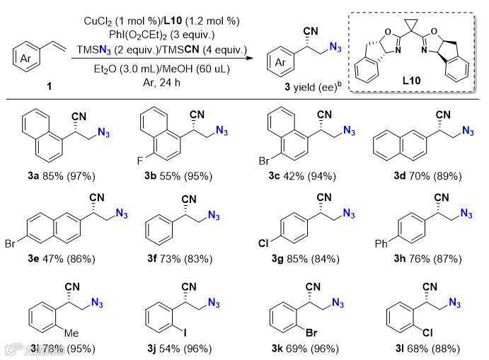 为了发展更具有实用性的转化反应,刘国生与林振阳团队尝试利用容易转化的氮自由基来启动反应;文献报道叠氮自由基是一种很好的氮自由基来源,容易发生烯烃的加成反应,在温和条件下可以发生一系列的转化,其中兰州大学的王少华课题组也报道了消旋烯烃的叠氮-氰基化反应。受此启发,刘国生与林振阳团队针对烯烃叠氮-氰基化的不对称催化展开研究,发现手性双噁唑啉配体L10是最佳的配体,反应得到优秀的对映体选择性(up to 97% ee);PhI(OOCEt)2是最理想的氧化剂来氧化TMSN3产生叠氮自由基,反应以中等到良好的收率(up to 85%)得到相应的β-叠氮烷基腈类化合物。相对而言,该反应对底物的位阻比较敏感,苯环邻位位阻较大时,产物ee 值较高,但收率降低。