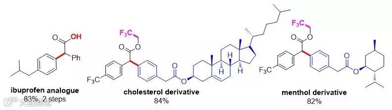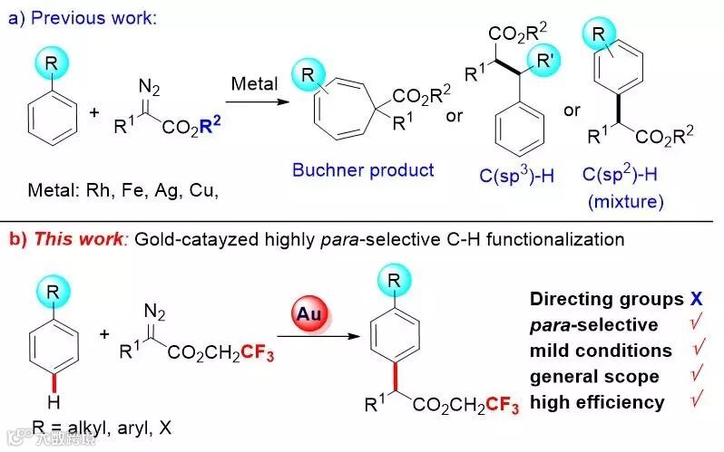 金催化剂由于其特殊的π-酸性和催化活性在有机合成研究中得到了显著进展,但是在重氮基化合物的转化中应用还比较少。近年来的研究表明,金催化剂对芳基的C(sp2)-H官能团化有特殊的活性。华东师范大学化学与分子工程学院刘路教授和张俊良教授课题组近年来致力于金催化剂催化的重氮基化合物对芳基的C(sp2)-H键官能化的研究。在实现了富电子芳香烃高选择性C(sp2)-H键官能团化的基础上(J. Am. Chem. Soc., 2014, 136, 6904-6907;Angew. Chem. Int. Ed., 2016, 55, 14807),使用金络合物为催化剂,同时使用重氮乙酸三氟乙酯为原料,可以有效的实现非活化芳基对位的C(sp2)-H键官能团化。该反应底物普适性良好、条件温和、区域选择性高且催化剂负载量低。反应可以放大到克级规模,在天然产物和药物活性分子的合成(如布洛芬类似物)以及后期修饰(如薄荷醇和胆固醇衍生物)中有着潜在的应用。