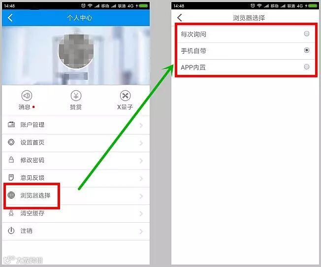 如果您勾选了上图中的“记住我的选择”,那以后App就自动延用您的选择。当您想更改时,点击左上角头像进入“个人中心”即可设置: