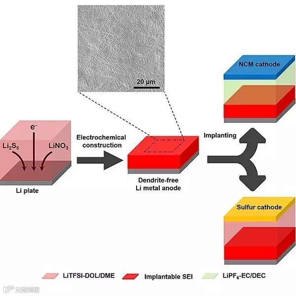 为了构建稳定的固液界面,抑制枝晶生长,清华大学的张强研究团队与河南师范大学联合采用含有硝酸锂和多硫化锂的醚类电解液作为诱导剂,通过电沉积的方法预先在金属锂表面沉积一层可移植的固态电解质保护膜。含有保护层的金属锂可以移植到不含任何负极保护剂、添加剂的电解液中稳定利用,抑制锂枝晶的形成和生长,从而提高负极的利用率。当采用硫或者三元氧化物正极材料,分别在醚类或碳酸酯类电解液中与上述带有固态电解质界面膜的金属锂结合,固态电解质保护膜可以移植到新体系的电池中抑制金属锂枝晶的生长,成功实现了高能量密度高稳定性的锂硫电池、锂金属电池的有效构筑。