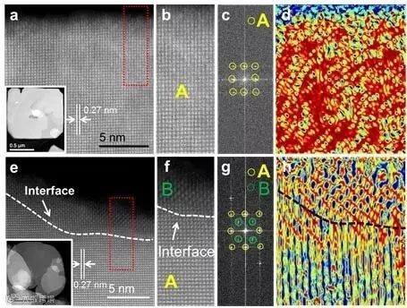近日,北京航空航天大学郝维昌教授研究小组和澳大利亚伍伦贡大学杜轶博士研究小组合作报道了一种通过应力工程在单一化合物的二维半导体纳米片(BiOBr)中构建侧向赝异质结(lateral pseudoheterostructure)的方法。他们发现由于BiOBr具有层状的二维结构,其晶体结构和电子结构对应力非常敏感。利用水热合成的方法,他们在CTAB作为溴来源以及层状结构模板的合成条件下,可以通过控制纳米片的生长过程调节应力的大小。当纳米片中的应力通过边缘结构的重构有效释放时,可以得到应力在纳米片边缘与中心部分的不同分布。如图1所示,在有不同应力的区域就会产生一个干净和连续的平整界面。