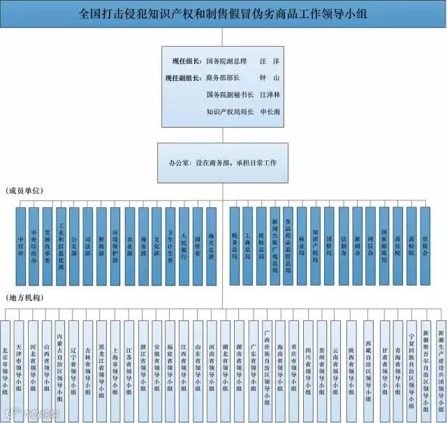 领导小组组长由一位国务院副总理兼任,成员包括行政执法部门、司法机关、综合管理部门、宣传部门等近30个单位,领导小组办公室设在商务部,承担领导小组日常工作。同时,全国各地也成立了相应的领导小组及办公室,形成上下一体的工作体系。