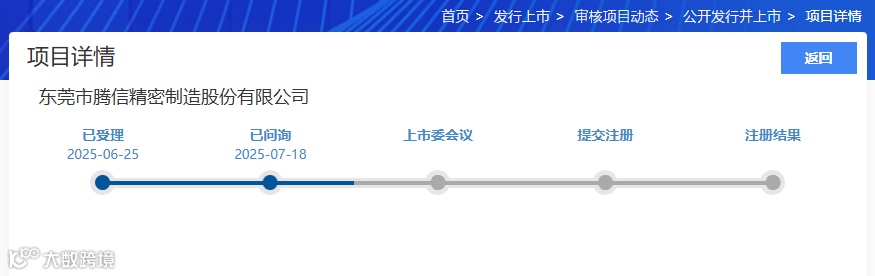 腾信精密北交所IPO于2025年6月25日获受理,2025年7月18日北交所下发了第一次审核问询函。
