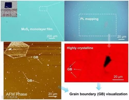 最近,香港中文大学科研人员与合作者采用低成本、简易的CVD法,在二氧化硅衬底上实现了大面积高结晶化的连续均匀的单层MoS2薄膜,其内部的晶化尺寸达数十微米。与通常采用的氧化钼前驱体合成MoS2薄膜相比,本工作使用的钼酸铵可极大促进MoS2单晶生长,从而提高其晶化尺寸。此外,本方法所采用的倒置石英舟可有效控制前驱体的沉积速率,使得衬底上MoS2成核密度较低,从而确保制备出单层薄膜。有趣的是,单层MoS2薄膜的晶界可在光致发光和原子力显微镜相位成像中明显探测到,相应的晶界密度低至0.04 μm–1。由于薄膜的高晶化以及均匀等特性,MoS2电输运特性具有空间均一性,并且在沟道尺寸逐渐增加时仍保持较高的载流子迁移率。