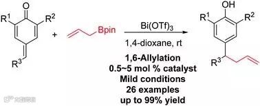 最近南开大学化学学院的李鑫课题组报道了在0.5-5 mol%的三氟甲磺酸铋催化下,用烯丙基硼酸频哪醇酯作为烯丙基化试剂,高效地实现了对亚甲基醌的1,6-烯丙基化反应。该反应是首例报道的1,6-烯丙基加成反应。