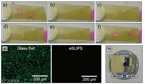进一步将上述经过hMI-dPG修饰的多孔材料进行亲脂性溶剂灌注(5-10 s),得到性能优异的eSLIPS涂层。令人惊喜的是,在该体系中日常生活所用的葵花油作为亲脂性润滑剂,其效果与纯十六烷的效果类似。而且,该eSLIPS涂层具有更好的透光性和抗细胞粘附性。