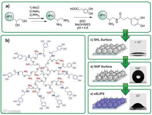 近日,柏林自由大学(Freie Universität Berlin)的研究团队受贻贝足蛋白结构(mfp-5)启发,合成了树枝状的仿贻贝聚甘油分子,基于此化合物自交联制备了在不同基底具有超强吸附特性的超亲水涂层表面(SHL),进一步借助非含氟脂肪酸修饰改性成功构筑多种超疏水表面(SHP);同时,受“猪笼草”(Nepenthes)自润滑超疏层结构启发,构筑了耐久性优异的环境友好型自润滑涂层(environmentally friendly slippery surface, eSLIPS),展现出良好的自清洁能力。