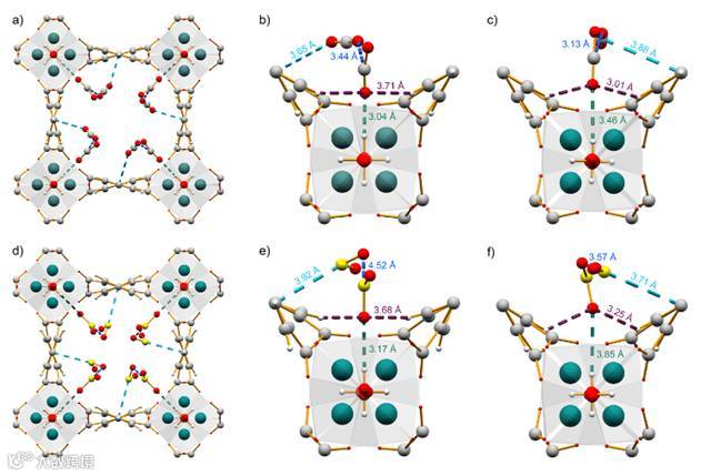 研究人员进一步通过同步辐射X光衍射、显微红外、非弹性中子散射等实验从分子角度全面揭示了二氧化硫在 MFM-300(In)中的吸附机制。他们发现,被吸附的二氧化硫分子与MFM-300(In)孔壁上一系列官能团形成定向超分子作用力,其中包括与羟基形成的类氢键作用以及二氧化硫分子间的二极具作用(图2)。研究人员通过原位中子散射以及显微红外谱学手段直接观测到了这些极其微弱的超分子作用力。相比之下,二氧化碳和氮气分子与材料孔壁的作用力就要微弱的多了。 这合理地解释了该材料对于二氧化硫的超高选择性。