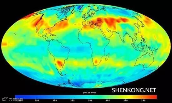 全球二氧化碳浓度图。图片来源:Shenkong.net