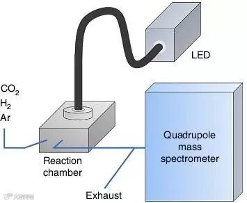 接着,研究人员将少量Rh/Al2O3催化剂放入反应室中,并通入CO2和H2的混合物,同时质谱仪器检测反应的产物。他们发现,当将纳米颗粒加热到300摄氏度时,反应会产生甲烷和一氧化碳的等量混合物。而当关闭热源,用高功率的紫外LED灯照射时,他们惊讶地发现,CO2和H2的反应在室温下几乎能完全生成甲烷,选择性高达98%,并且反应速率是热催化反应的两倍。