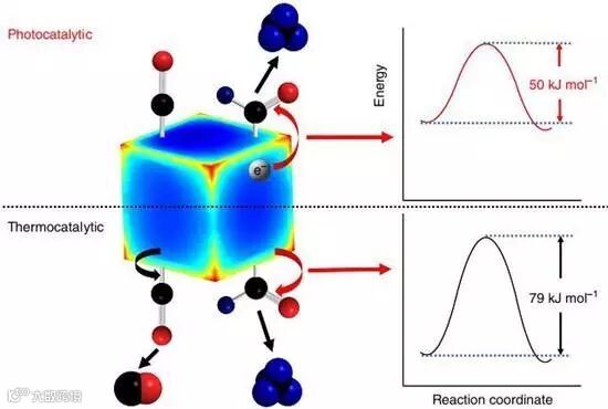 随后,研究人员对这种光催化反应的机理进行了详细研究。他们发现,由光催化反应产生的热电子能够选择性地激活中间体CHO中的C-O键,并且能降低反应的表观活化能,因而可以实现高选择性、高活性的CO2加氢甲烷化反应。