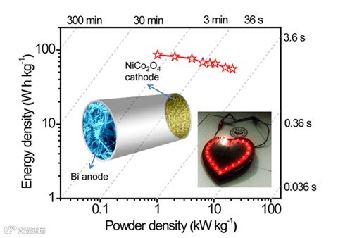 最近,中山大学化学学院卢锡洪副教授团队成功研制了一款柔性可快速充放的水系Ni//Bi电池。通过在碳布上直接可控生长三维单晶Bi纳米结构,不仅可以提供更高的比表面积和更多的活性位点,而且可以极大地提升高倍率下的氧化还原反应速率。因此,这种具有独特单晶三维分层纳米结构Bi材料具有较高的容量,优异的倍率和长循环性能。具体而言,这种Bi电极的比容量高达96.2 mA h g-1;当电流密度从4.5增加到45 A g-1时,仍有94%的容量保持率,表明其很好的倍率性能。此外,这种Bi电极具有极好的循环稳定性,经过10000次充放电循环后仅有4%的容量衰减,这是目前报道的铋基电极中最好的循环性能。原位拉曼结果表明Bi电极在水性溶液中发生的是Bi0到Bi3+的可逆氧化还原反应。更重要的是,此工作首次报道了基于Bi电极为负极,NiCo2O4为正极组装的柔性NiCo2O4//Bi水性可充放电池,这种电池具有优异的电化学性能和柔韧性,最大能量密度高达85.8 W h kg-1,最高功率密度达到21 kW kg-1,且可以快速充放电。该工作表明了金属铋是一种很有潜力的水性可充放电池负极材料。