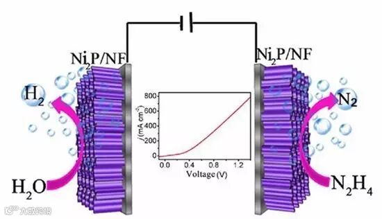 尽管如此,阳极析氧反应需要较大的能量形成氧-氧键,这一问题仍然是电分解水的瓶颈。此外,由于产生的氧气利用价值不高,且与阴极产生氢气混合存在潜在的危险,需要附加分离步骤,从而增加了成本。因此,寻找一种热力学更容易发生的氧化反应来取代阳极析氧反应,使得阴极析氢更加节能,进而提高整个电解池的能量转化效率。最近,四川大学孙旭平课题组在泡沫镍上发展的三维磷化镍纳米片阵列,对肼具有高效的催化氧化效果,并且肼氧化反应(HzOR)电位相对水的氧化电位低很多,因此可以用阳极肼氧化代替水氧化,使阴极析氢能量转换效率提高。在两电极(HER║HzOR)电解池中,当电流密度为500 mA cm-2时,仅需要的电压为1.0 V,然而在两电极(HER║OER)电解池中,当电流密度为20 mA cm-2时,则需要的电压为1.6 V。该工作为高效低能耗析氢提供了一种新思路。这一成果近期发表在《Angew. Chem. Int. Ed.》上,文章的第一作者是西华师范大学与四川大学联合培养的硕士生唐春,四川大学本科生张蓉为共同第一作者。