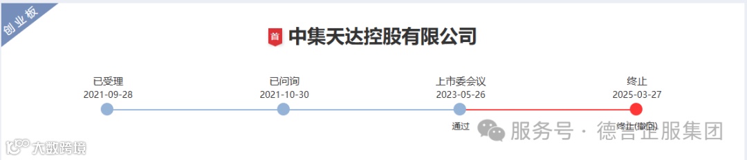 据德言企服了解,中集天达创业板IPO于2021年9月28日被受理,期间共收到两轮审核问询函和一轮审核中心意见落实函,于2023年5月26日通过上市委会议,2025年3月27日,发行人及保荐机构主动撤回上市申请,IPO审核终止。