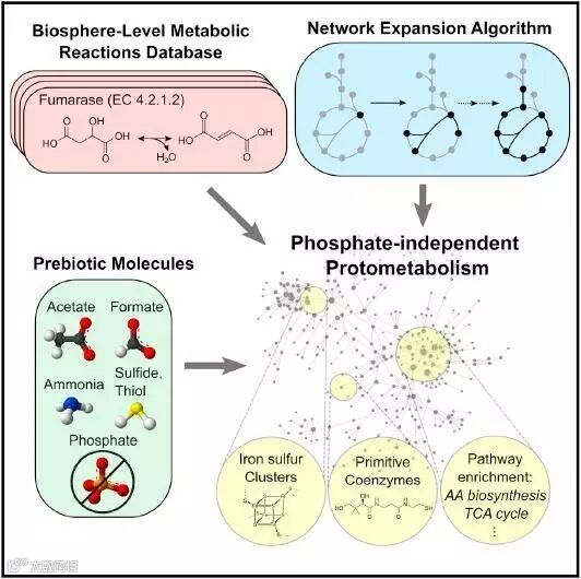 地球上的生命从何而来?目前占主导地位的是化学起源说。这一假说大致将生命的演化描述为:无机小分子→有机小分子→有机大分子→多分子体系→原始生命。但这一假说也存在一些不好解决的问题。比如,生命体内的遗传物质核酸以及能量代谢的关键分子三磷酸腺苷(ATP)都含有磷酸基团,而地球上的磷酸盐主要存在于一些稳定的岩石和矿物中,对于简单的原始生命形式来说并不容易获得。这又演变成了一个“先有鸡还是先有蛋”的问题:较为复杂的原始生命形式要想合成关键的核酸和ATP,需要先有容易获得的磷酸来源;而要想容易地从稳定的岩石和矿物中获得这些磷酸盐,又要先有较为复杂的原始生命形式来支持。众多的争论和假设中,有一个很有意思,既然找不到一个合理的途径将磷酸盐引入原始生物圈中,那就绕开磷酸盐这个难题,是否存在一种可能,在依赖磷酸的复杂生命形式出现之前,就已经存在某种原始生命形式,可以不依靠磷酸盐而生存?这一假说虽然能解决上面那个“鸡与蛋”难题,但到目前为止还缺乏系统的证据。最近,美国波士顿大学的Daniel Segrѐ教授团队基于该课题组建立的模型和算法,通过系统生物学的研究方法证实了在磷酸盐引入生物体之前存在其他代谢途径,以硫元素为基础的多种催化与供能过程,而这种元素早在上亿年前便大量存在于海洋与地壳之中。就像是古生物学家找到生物进化路线上某种关键的化石一样,Segrѐ等人这一研究结果,找到了生命起源过程中的“代谢化石”,连接上了含磷酸基团原始生命形式与简单分子之间失落的那一环。