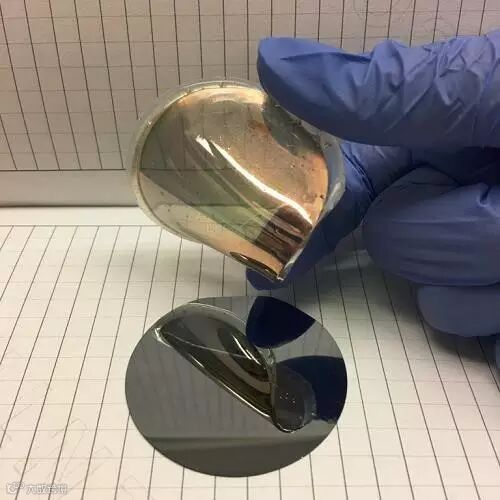 近几年,以可穿戴设备为代表的柔性电子技术进步迅速,或许会成为下一代电子设备的发展方向。科学家尝试使用诸如碳纳米管、石墨烯、导电聚合物等多种类型材料作为柔性电子设备的基底,超薄金属膜也是其中很有希望的一类。金属在超薄膜状态下,具有很好的透光度、柔性以及导电性能,不过现在的制备手段主要是真空沉积或者溅射,成本高昂不说,得到的还大多是多晶结构的产品,而多晶电子材料晶界处发生的电子-空穴复合,极大地限制了其性能。近日,美国密苏里科技大学Jay A. Switzer等人在Science 上发表文章,以单晶硅为模板,通过外延剥离法制备了适用于柔性电子器件的单晶金箔(Au(111))。这种方法简单且廉价,单晶硅模板可重复利用,所得的透明单晶金箔厚度仅28 nm,具有芯片级尺寸,薄层电阻低至7 Ω/sq,且经过4000次反复弯曲循环后,该金箔的电阻只增加了4%。随后,研究者在金箔上旋涂制备了基于三(联吡啶)钌(II)的有机发光二极管(OLED),实验证明这种单晶金箔的柔性和透光度都比较理想。为了研究金箔的单晶性质,研究者分别在多晶衬底(不锈钢)和金箔表面电沉积一层无机半导体Cu2O,制备了无机二极管。以金箔为衬底的器件表现出二极管品质因子n 为1.6(理想二极管的品质因子n 为1.0),而对应的多晶衬底的二极管品质因子n 为3.1。另外,在单晶金箔上电沉积的氧化锌纳米线也显示出良好的柔韧性,该纳米线能够经受500次的弯曲循环而无性能衰减。