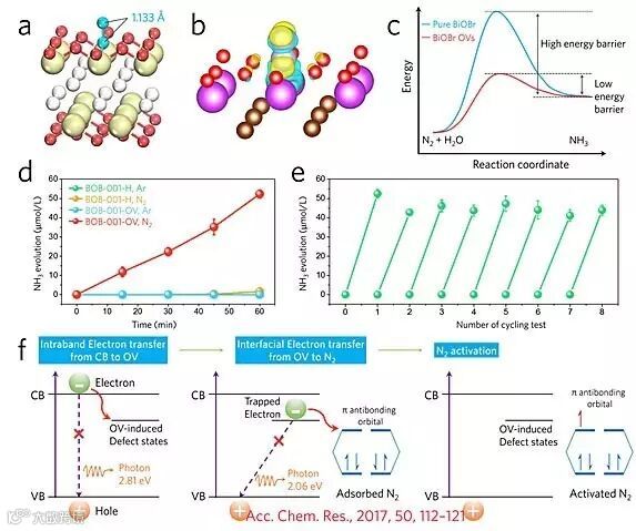 富含表面氧空位的溴氧化铋无牺牲剂无贵金属高效光催化固氮。受生物固氮的基本过程启发,利用溴氧化铋{001}晶面氧空位模拟固氮酶中的FeMo辅因子对氮分子进行活化以削弱其共价键,以可见光作为能量供给,水作为绿色质子源,实现无牺牲剂无贵金属辅助的高效可见光催化固氮产生氨气的反应。