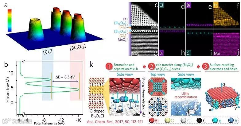均相碳掺杂氯氧化铋光催化分解水析出氧气。通过采用先水热碳化、后煅烧的两步法成功把碳掺杂剂均相注入到Bi3O4Cl晶格内部,碳掺杂Bi3O4Cl纳米片由于126倍的内电场强度提高实现了高达80%的体相电荷分离效率,由此可以在可见光照射下高效光催化分解纯水析出氧气。