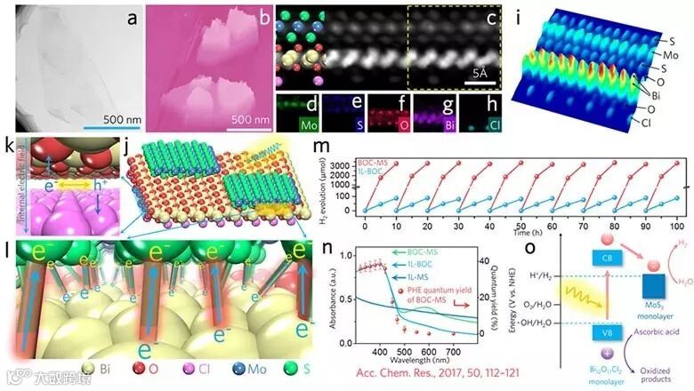 双面神双层异质结高效光催化分解水析出氢气。利用氧空位的丰富表面化学特性,把单层金属相MoS2组装到单层且富含氧空位Bi12O17Cl2的[Bi12O17]端面,合成出双面神双层异质结(Cl2)-(Bi12O17)-(MoS2)。该催化剂能够原子水平精确控制光生电荷的体相分离和表面转移,光生电荷寿命高达3446 ns,420纳米可见光处的光催化产氢量子效率为36%。