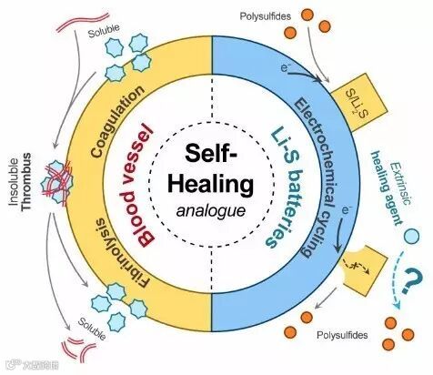 类比血管中的自愈过程(血栓溶解),提出用于锂硫电池的修复剂——多硫化物获得长寿命、高比能、自修复锂硫二次电池。