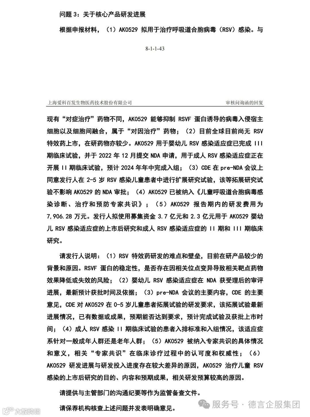 (6)AK0529 研发进展与研发投入进度存在较大差异的原因,AK0529 治疗儿童 RSV感染的上市后研究的目的、内容和预期成果,相关研发预算较高的原因。