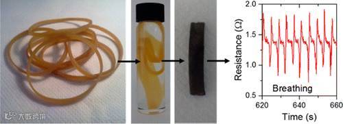“石墨烯+橡皮筋”传感器。图片来源:ACS Nano