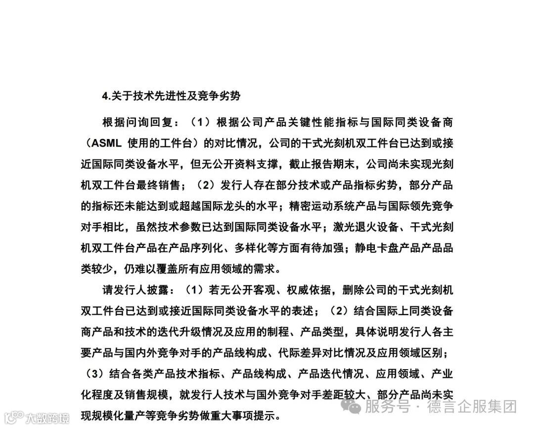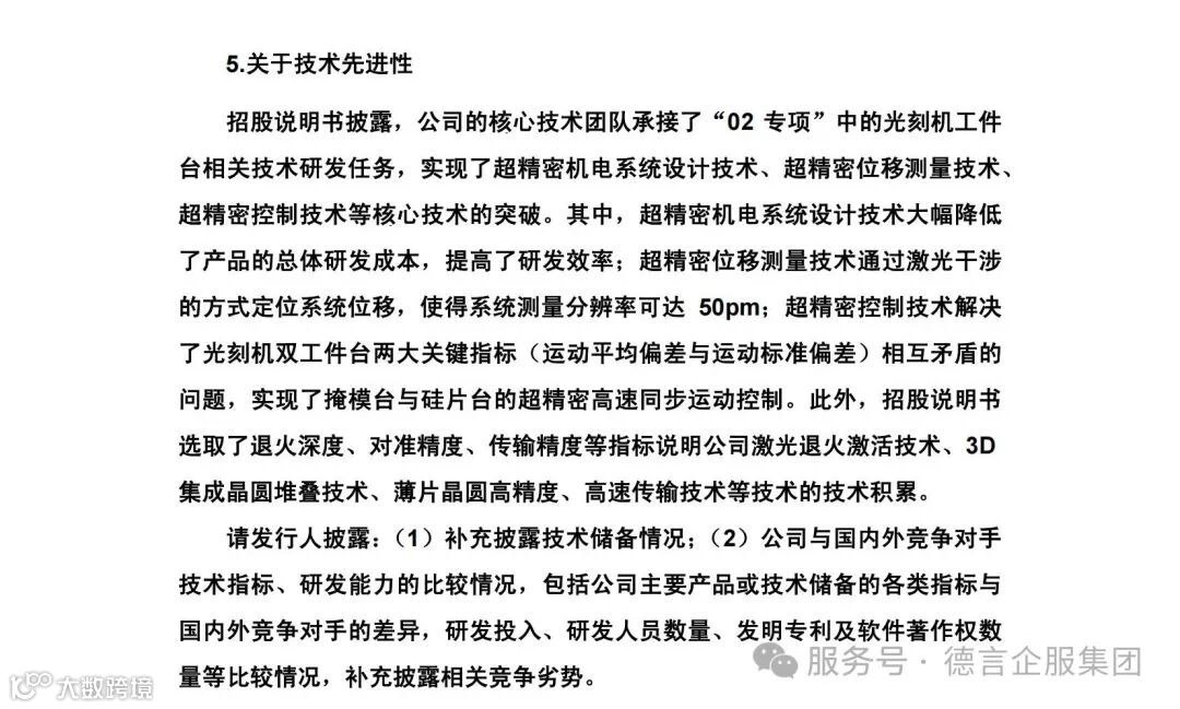 华卓精科IPO进程中审核问询问题中知识产权方面的主要问询点4为【技术先进性】,上市委在首轮问询中重点问询了: