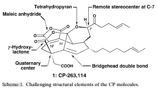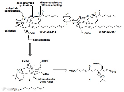 CP分子合成的难点如图所示,包括高张力内酯环的构建、桥头带有双键的桥环骨架构建等。合成策略包括以分子内DA反应构建桥环骨架、以氧化反应和酸催化的环化反应构建内酯环和四氢吡喃环等。