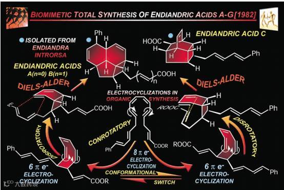 基于仿生合成策略,多烯底物先发生8Π电环化反应,接着发生6Π电环化反应(顺旋或者对旋)串联分子内DA反应,非常简洁高效地完成了Endiandric acids类天然产物的全合成。