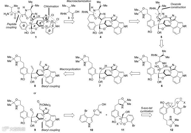 Diazonamide A的合成策略中以肽键的形成、大环内酰胺的形成、RCM反应关大环、二芳基的偶联反应等为关键步骤。