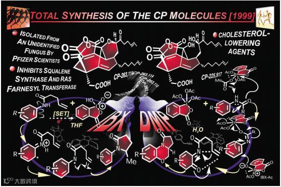 Phil S. Baran于1997-2001年在斯克里普斯研究所跟随K. C. Nicolaou教授读博士,博士期间主要工作是CP分子的全合成,两篇Angew上的Communication(Angew. Chem. Int. Ed., 1999, 38, 1669; Angew. Chem. Int. Ed., 1999, 38, 1676, K. C. Nicolaou先生Top 5文章之一),三篇JACS的full paper(J. Am. Chem. Soc., 2002, 124, 2183-2189; J. Am. Chem. Soc., 2002, 124, 2190-2201; J. Am. Chem. Soc., 2002, 124, 2202-2211),并在合成过程中开发了DMP和IBX等高价碘试剂介导的氧化关环反应等(J. Am. Chem. Soc., 2002, 124, 2212-2220; J. Am. Chem. Soc., 2002, 124, 2221-2232; J. Am. Chem. Soc., 2002, 124, 2233-2244)。而在一篇Angew的综述中(Angew. Chem. Int. Ed., 2002, 41, 2678-2720),Baran等人讲述了三代合成路线三次向目标CP分子冲击的故事,像走迷宫一样,又像打怪一样,最终战胜怪兽,合成了CP分子。